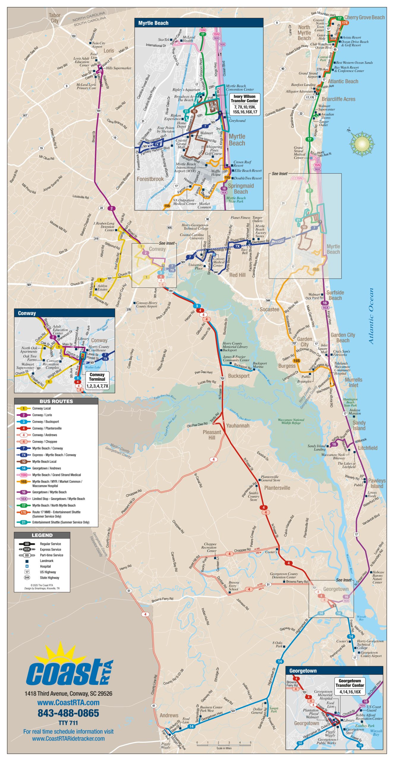 Coast RTA is the public transit provider for Horry & Georgetown counties. The Coast RTA Fixed Route bus system consists of 10 regularly scheduled routes servicing Horry and Georgetown Counties. The fixed routes include Andrews, Bucksport, Conway, Garden City, Georgetown, Loris, Murrells Inlet, Myrtle Beach, Pawleys Island and Surfside Beach. Our Fixed Route service operates seven days a week, 362 days per year. Coast RTA observes the holidays of New Year’s Day, Thanksgiving and Christmas so its employees may spend time with their families.